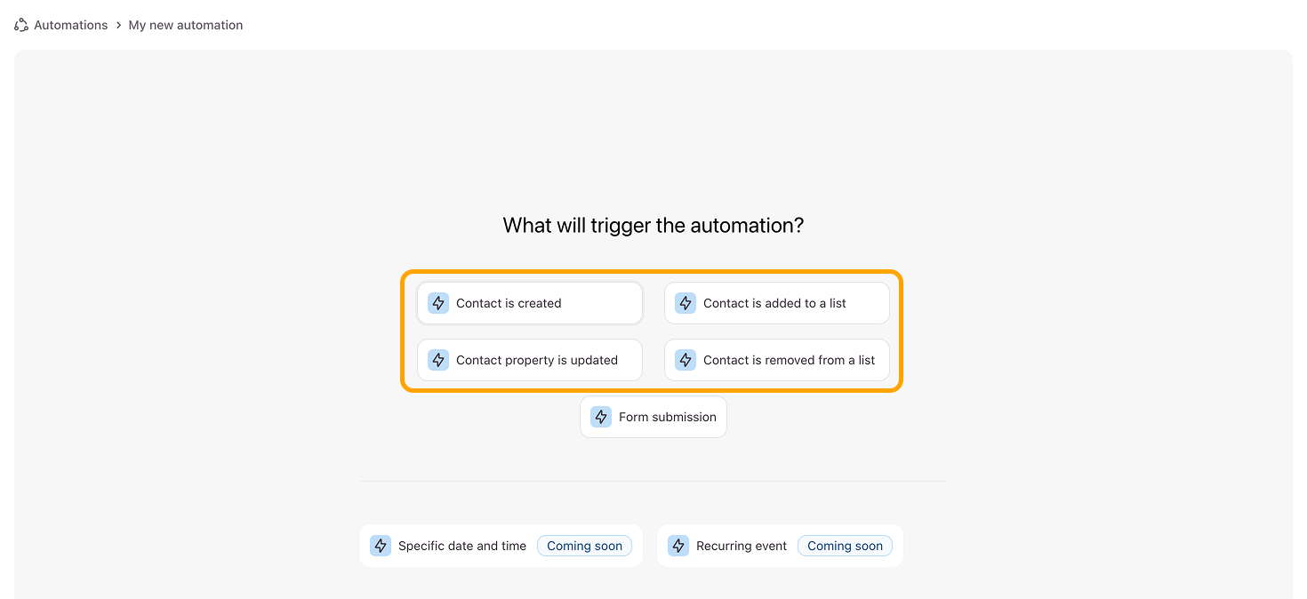 - Es el momento de seleccionar qué quieres que active la automatización. En este caso, opta por «Actividad o actualizaciones de contacto».