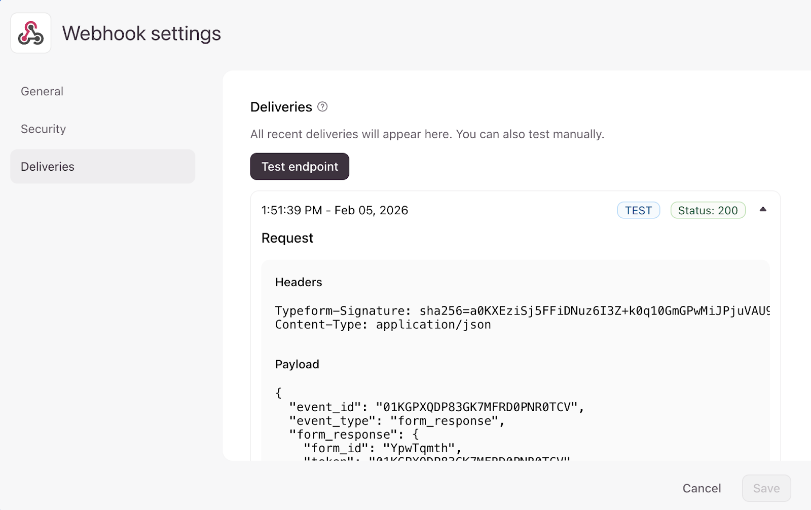 - Por otro lado, también puedes introducir el secreto de tu webhook para confirmar que las solicitudes vienen de Typeform y de nadie más. Puedes obtener más información sobre los secretos de webhook aquí.
