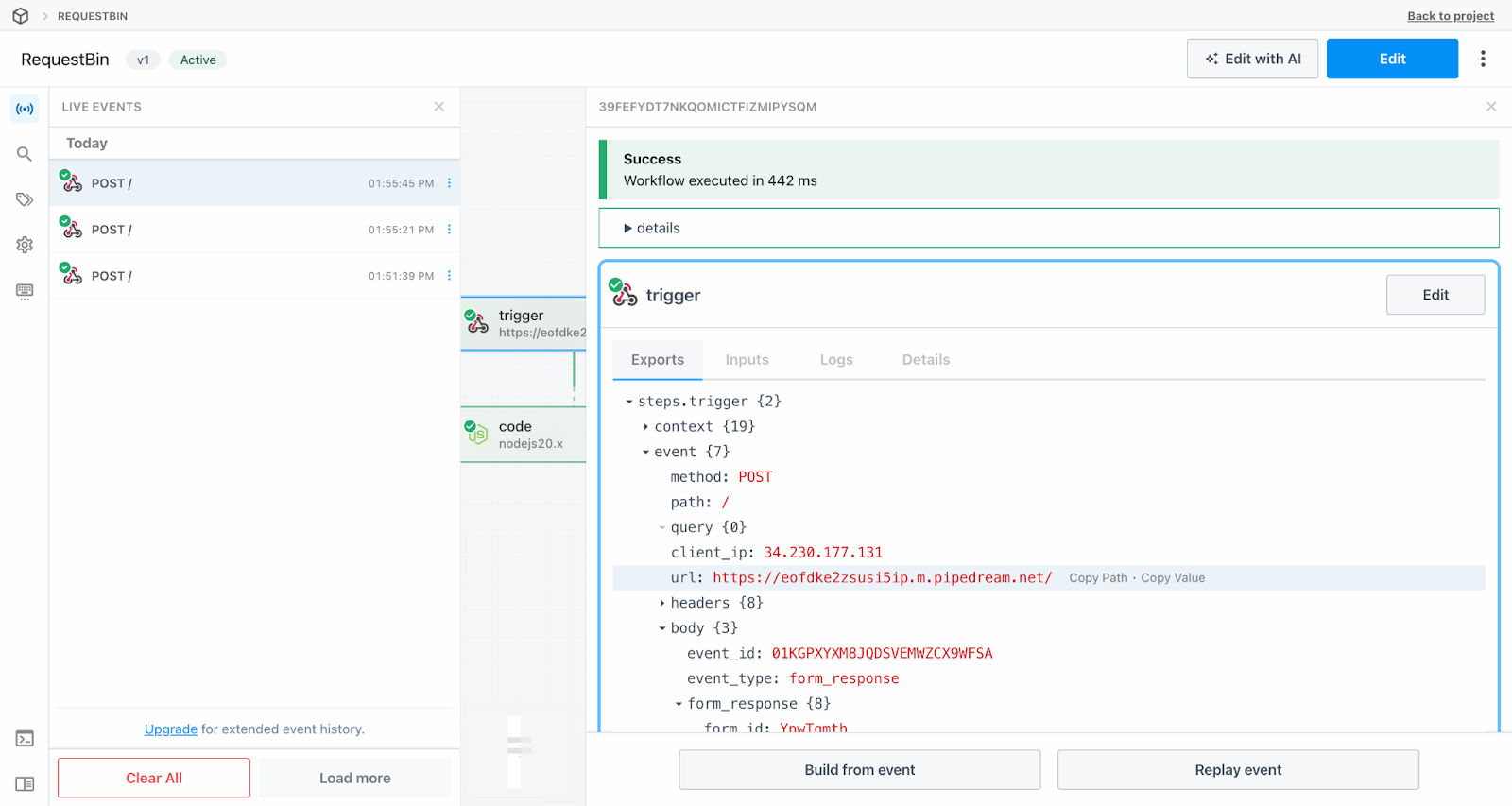 Para comprobar que tu automatización funciona correctamente, puedes crear una URL de prueba, en páginas web como https://requestbin.com, para recabar las respuestas simuladas enviadas a tu formulario. Estos envíos de prueba tendrán un aspecto similar al que se muestra en la siguiente captura de pantalla: